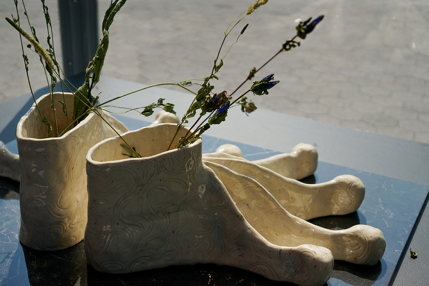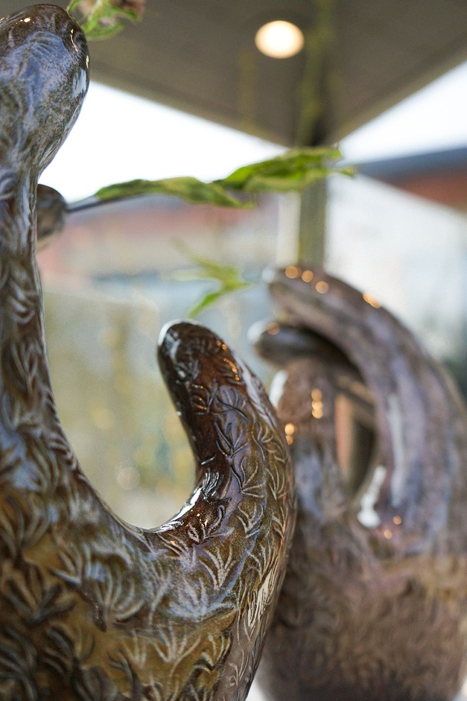 Genius loci, l’esprit des lieux… voilà ce qui caractérise bien les mondes et personnages que Fanny Mesnard fait sortir de la terre et dont elle tire ses céramiques. Dans le monde romain, chaque lieu était protégé par un génie qu’il fallait admirer ou craindre. Ces céramiques hybrides mélangent l’animal et le végétal et, pour elles aussi, on ne sait s’il faut en avoir peur ou en rire. Dans chaque refuge se croisent le loup, la grenouille, le singe, le monstre ou le bon génie, selon notre imagination. Ce monde fantasmatique que Fanny Mesnard nous prête le temps de l’exposition, vient nourrir une mythologie nouvelle pour ces lieux certes marqués par l’histoire industrielle de Montréal, mais paradoxalement sortis récemment de terre. Les fleurs cueillies aux alentours témoignent de la transition des lieux et exposent leurs charmes dans les céramiques aux glacis précieux et un peu magiques de Fanny Mesnard. C’est le début d’une histoire qui prend place ici.